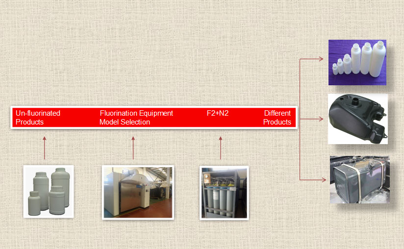 وتشمل المنتجات المفلورة السطحية خزانات وقود المركبات الآلية ، والإكسسوارات الهندسية ، والآلات الزراعية وحديقة ، والإكسسوارات الداخلية للسيارات ، زجاجات التعبئة والتغليف HDPE.